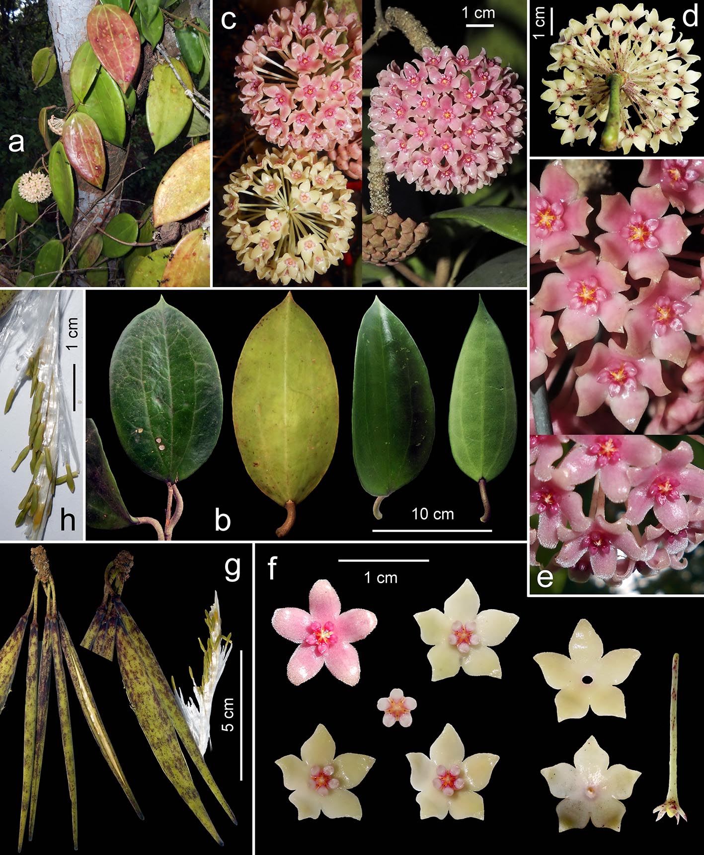 Fig. 2 Hoya hanhiae sp. nov. (a) flowering plant in natural habitat, (b) eaves, (c) inflorecscences with flowers of various coloration, (d) inflorescence, view from below, (e)flowers, frontal and half-side views, (f) flowers and their parts, (g) fruits, (h) seeds.Photographs by Le Tuan Anhand Nguyen Thuy Hanh, design and image correction by L.Averyanov.