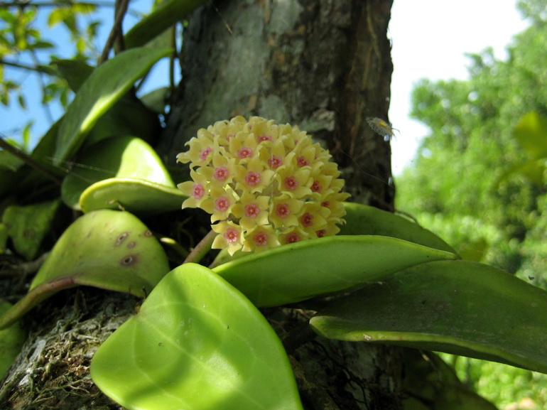 Hoya hanhiae V. T. Pham et Aver., sp. nov. Epiphytic semiwoody vine with white latex. Young stems, petioles and peduncles pubescent, glabrous when old. Stems twisted, 3–5 m long, rooting at nodes and internodes, green when young, turning brown green, white-gray when old, terete, 2.5–4 mm in diam., with swollen nodes, internodes to 12 cm long. Leaves decussate, fleshy; petiole twisted, hairy when young, 1.5–3.5(5) cm long, 3–4(6) mm in diam., terete, dark green with dirty purple marks; leaf blade ovate to broadly ovate, glabrous, 6–17 cm long, 4–10 cm wide, rounded to cuneate at the base, shortly acuminate at apex, with entire, slightly revolute margin, 3–5 veined from the base with the 2 veins nearest the magins usually indistinct, visible adaxially, obscure abaxially; secondary veinlets anastomosing-reticulate, glossy green adaxially, dull white-grey, uneven abaxially, with concave veins in old marcescent leaves. Inflorescences extra-axillary, semi-globose, many flowered umbel-like; peduncle terete, 2.5–9 cm long, 2–4 mm in diam., swollen at apex, green to dull green. Flowers 25–43, pedicels light yellow to pink, tinged with purple, slender, glabrous, 1.5 cm long, about 0.75 mm in diam.; calyx of 5 sepals, light yellow or light pink, sometimes tinged with dirty purple, triangular, acute, glabrous, about 1.5 mm long, 1 mm wide; corolla 5-lobed, fleshy, pale yellow to pink-purple, about 1 cm in diam.; lobes broadly ovate, outside glabrous with obscure veins, inside pubescent, about 4 mm long, 3 mm wide, spreading; apex subacute, margins slightly recurved; corona of 5 segments, 3–3.5 mm in diam., concave at center; corona segments more or less erect, pink to pink-purple, glossy, grooved outside, 1.8–2 mm tall, 0.9–1.1 mm wide, oblong from side view, ovate from above, outer angle subacute, light pink, inner angle acute, red-pink; pollinarium with two oblong, golden-yellow, pollinia about 0.6 mm long, 0.2 mm wide, corpusculum chestnut, about 0.15 mm long and wide; ovaries 2, free, superior, light green, bottle shaped, about 1.2–1.5 mm tall, 0.9–1.1 mm wide. Follicles narrowly-ensiform, about 10 cm long, 0.6–0.8 cm in diam., light green with many dirty purple marks. Seeds many, spindle shaped, about 6 mm long, 1 mm wide, apically with white silky coma, 3 cm long.