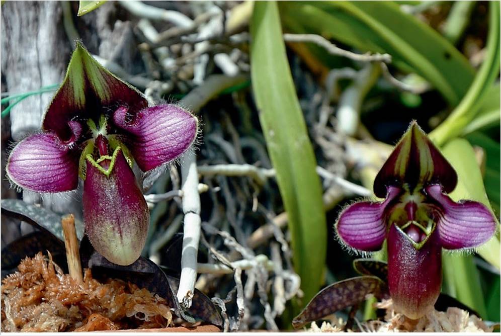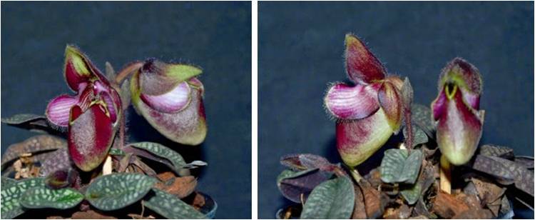 While the plants with their marbled leaves appear quite similar to Paph. canhii, the blossom at first glance clearly show much broader petals an intensive red-purple coloring, as well as an entirely different staminodium. Also the underside of the leaves differs significantly in the new species. While Paph. canhii is rather red- purple speckled, this new species shows a gray green bottom with wide purple veins.