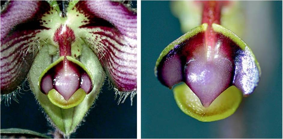 Pic 3. Staminodium of Paphiopedilum rungsuriyanum is completely different from those of Pa. canhii - Loài Paphiopedilum rungsuriyanum có bộ nhị lép khác biệt hoàn toàn so với P. canhii. Nguồn Orchideen Journal (Vol.2-1, 2014)
