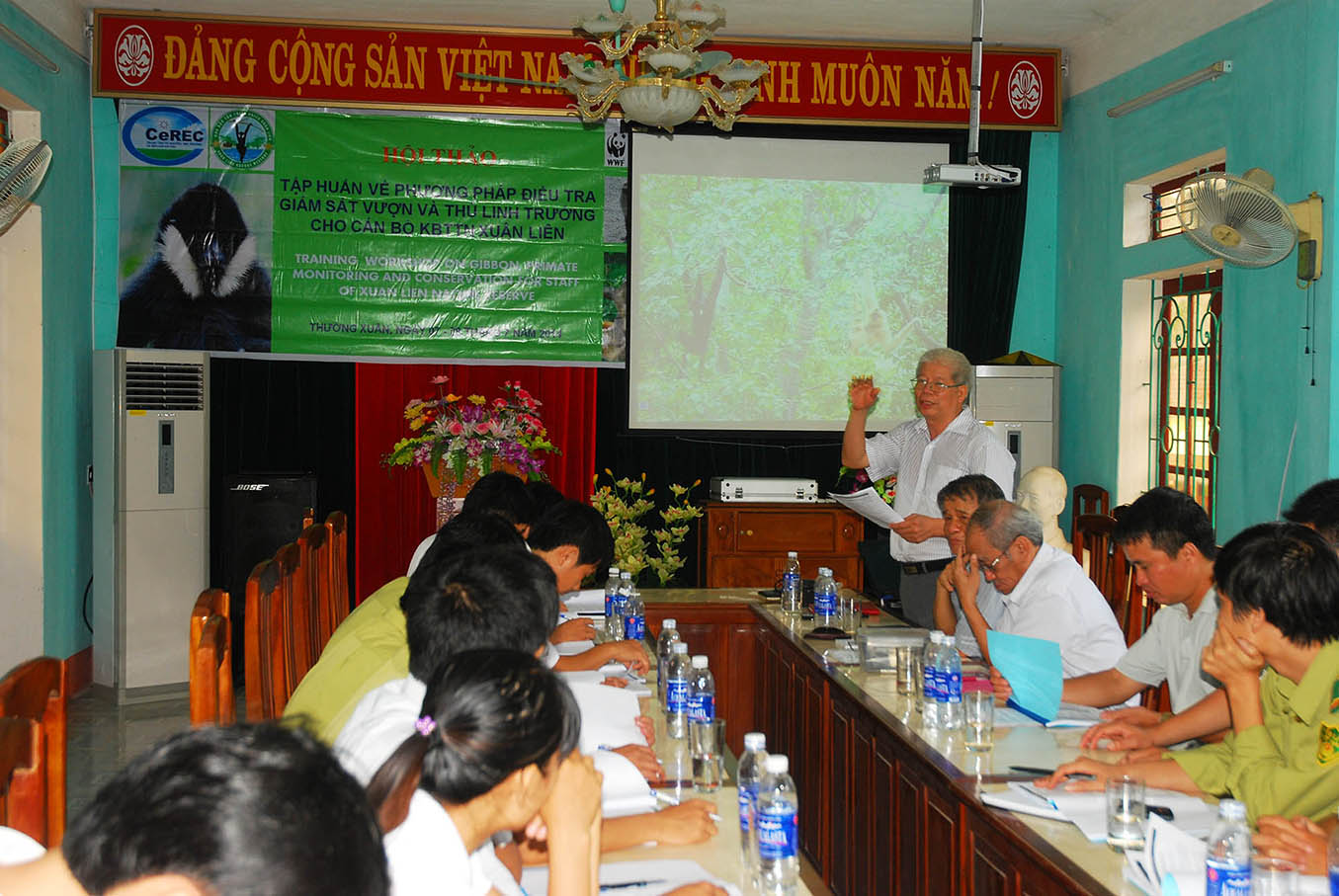 Training workshop "Gibbon and Primate monitoring and conservation training for staff members of Xuan Lien Nature Reserve, Thanh Hoa Province, Vietnam" was organized by Centre for Resources, Environment and Climate change (CeREC) from 10-28 July 2014 at Xuan Lien Nature Reserve, Thuong Xuan District, Thanh Hoa Province, Vietnam. The training curriculum includes 3 parts: Classroom training; Field training; and Final workshop. The classroom training lasted for 4 days including 2-day theory training before field training and 2 - day data analysis and presentation after field training. The field training lasted for 12 days of gibbon survey at Xuan Lien NR. After data analysis, one-day final workshop was organized for presenting of Gibbon survey results to Management Board of Xuan Lien Nature Reserve and other local stakeholder for information sharing.
